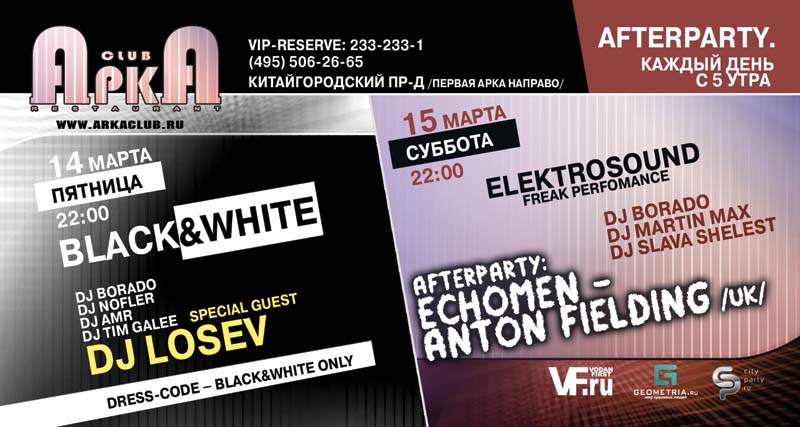 Клуб АркА представляет каждую субботу вечеринки "ELEKTROSOUND". <br /><br />Дружелюбная атмосфера и эффект настоящего праздника. Изящная публика и только избранные люди. Вечеринки отличаются исключительно качественной, "правильной" современной музыкой. Резидентами вечеринок "ELEKTROSOUND" являются зарубежные известные, талантливые и профессиональные диджеи.<br /><br />Сегодня у нас в гостях ANTON FIELDING [UK]<br /><br />Общая стилистика мероприятий - эксцентричное шоу от самых ярких и экзальтированных персонажей клубной культуры. <br /><br />DJ BORADO <br /><br />DJ MARTIN MAX [Sweden] <br /><br />DJ SLAVA SHELEST <br /><br />Echomen - ANTON FIELDING [UK] <br /><br />В 2000 году совместно с Graeme Stew и Chris Scott выпустили пластинку с двумя синглами - "Orient" и "One Way". Гармония треков образуется благодаря сочетанию различных талантов исполнителей: Антона, как ди-джея, Грема, как солиста, и Крисса, который смог придать композициям завершенное мелодичное звучание. Пластинку оценил сам Danny Howells. Результатом столь плодотворного сотрудничества стал выпуск в 2003 году синглов "Perpetual" и "Cure". Наступление 2004 года команда отпраздновала выходом очередного суперхита "Spirit", который выпустила на лейбле Forensic Records вместе с ремиксом Satoshi Tomiie. <br /><br />Afterparty с 5 утра<br /><br />Празднуем приезд DJ ANTON FIELDING<br /><br />Вход свободный. На входе действует Face Control. Dress-code. <br />Заказ столика по депозитной системе гарантирует максимально комфортный отдых и 100% проход гостям! <br />VIP Reserve: 233-233-1, 698-33-17, 506-25-65