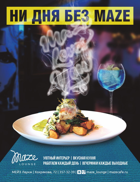 MAZE - это уникальное место, которое придется по вкусу самой разнообразной публике: от серьезных бизнесменов и до уличных художников. Место, которое соединяет в себе уютный интерьер с элементами арта, стильное музыкальное сопровождение, понятную изысканную кухню и интересную коктейльную карту.