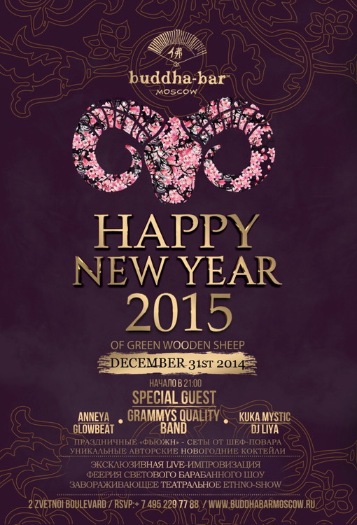 Легендарный lounge-ресторан Buddha-Bar Moscow приглашает встретить Новый Год 2015 – год зеленой деревянной козы - в притягательной атмосфере роскоши и благополучия! Натуральное дерево, благородное золото, изумрудный бархат - в эту ночь драгоценные интерьеры ресторана наполнятся притягательными акцентами в честь символа наступающего года. Торжество, достойное самой изысканной публики; программа, насыщенная лучшими шоу-событиями; энергетика, пронизанная утонченными удовольствиями – эксклюзивно в Buddha-Bar Moscow 31 декабря!