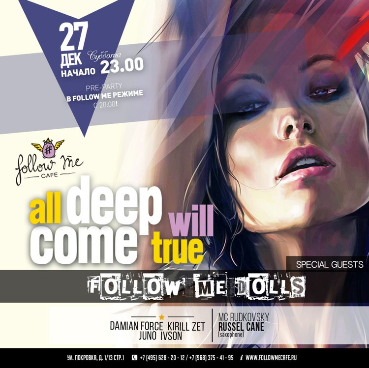 В эту субботу специальными гостями ночи станут наши прекрасные ангелы из шоу-балета от Follow Me Café. Вас ждут свежеиспеченные номера в стиле кабаре, а так же эпатажная танцевальная шоу-программа в рамках нашей традиционной музыкальной концепции All Deep Will Come True. Так же в эту ночь за ди-джейским пультом вы сможете наблюдать арт-директора клуба «Гараж», более известного под псевдонимом Juno. Приходите и погружайтесь в самые актуальные ритмы современности вместе с нами!