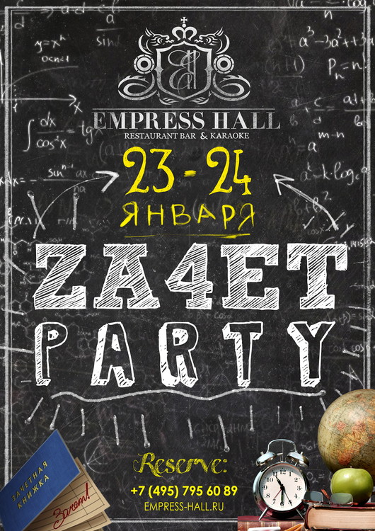 В Empress Hall Вы найдете все, что поможет забыть про унылые пары, лекции, семинары и оторваться, как следует каждому свободному студенту! Ждем Всех 23 и 24 января в лучшем Караоке-Баре Москвы Empress Hall. Проведи незабываемый вечер на "За4ет"!