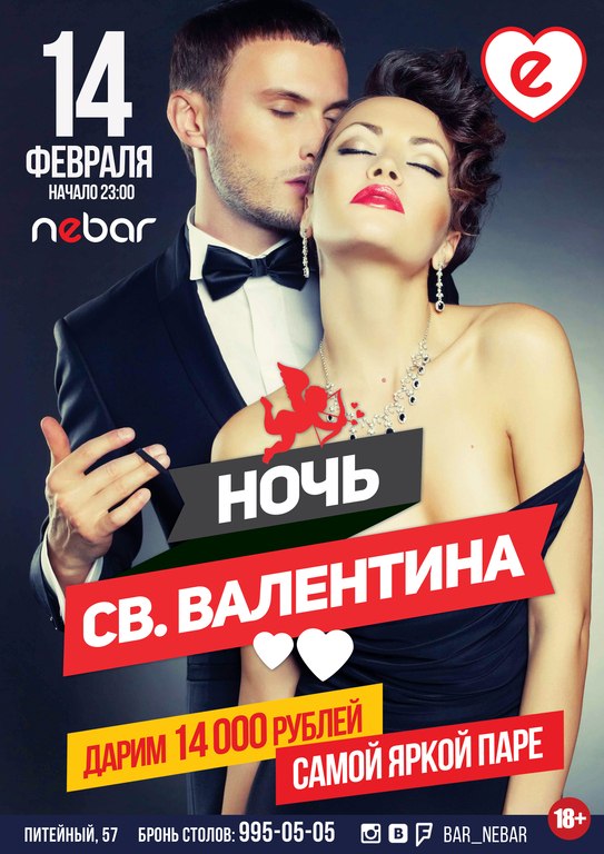 14 февраля самый мимимишный праздник! Кого-то с самого утра будут заваливать валентинками, кто-то сделает предложение даме своего сердца, ну а кто-то ждет поздравлений от сказочного принца… Как бы то ни было, ждем Вас, чтобы подарить Вам свою любовь, а также традиционно напоить и отлично потанцевать! Ночь будет пропитана романтикой, магией любви и страсти – прикоснись к прекрасному вместе с Nebar…