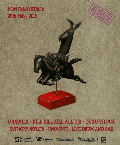 Друзья, рады сообщить, что 20 февраля в клубе KLЮTCH мы запускаем очередную неконцептную пати из серии PONYSLAYSTAGE . В этот раз широко известные в России и за ее пределами питерские музыканты будут играть для вас не характерный им саунд . Этой ночью dvj сет Андрея Зырянова (Психея), сайд проекты от Mind Cure (Grawlix) , Utopia (Duxuryluck), Digital Damage (Euphory Action), djсет от Севы Unquote , а также специальный live перфоманс саксофониста Дмитрия **|beatcoin| **Ермолинского !