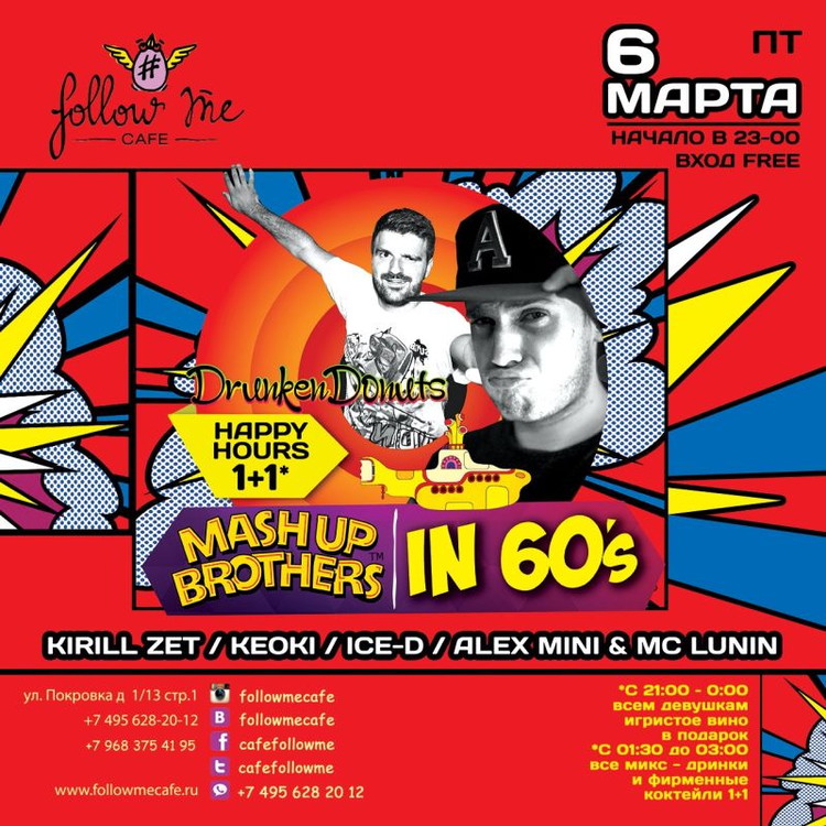 Make love not war! Mash Up Brothers и Follow Me Café знают как разнообразить ваш пятничный вечер и превратить его в красочную ночь с незабываемым продолжением! В этот раз мы отправимся американские 60-ые годы вместе с DJ Keoki & DJ Ice - D! Вас уже ждут цветочные декорации, любвеобильные взгляды, море улыбок, повышенное внимание со стороны наших барменов и самые веселые ритмы от резидентов Drunken Donuts!