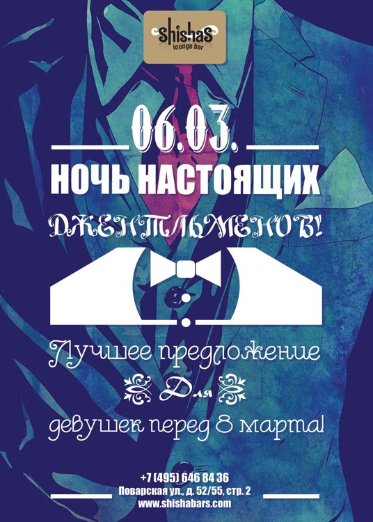 Ночь настоящих джентльменов в Shishas Lounge Bar на Поварской! Лучшее предложение для девушек перед 8 марта!