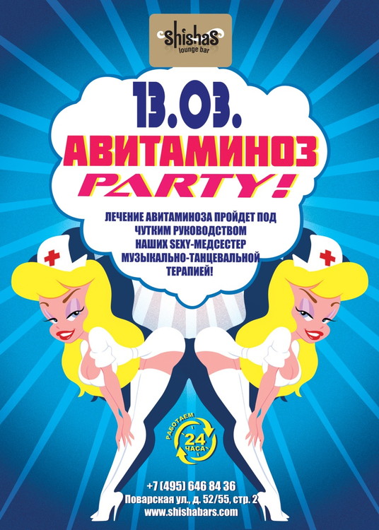 АВИТАМИНОЗ PARTY в Shishas Lounge Bar на Поварской! Начинаем бороться с последствиями зимы, набираться сил и весенних витаминов! Лечение авитаминоза пройдет под чутким руководством наших Sexy-медсестер музыкально-танцевальной терапией!