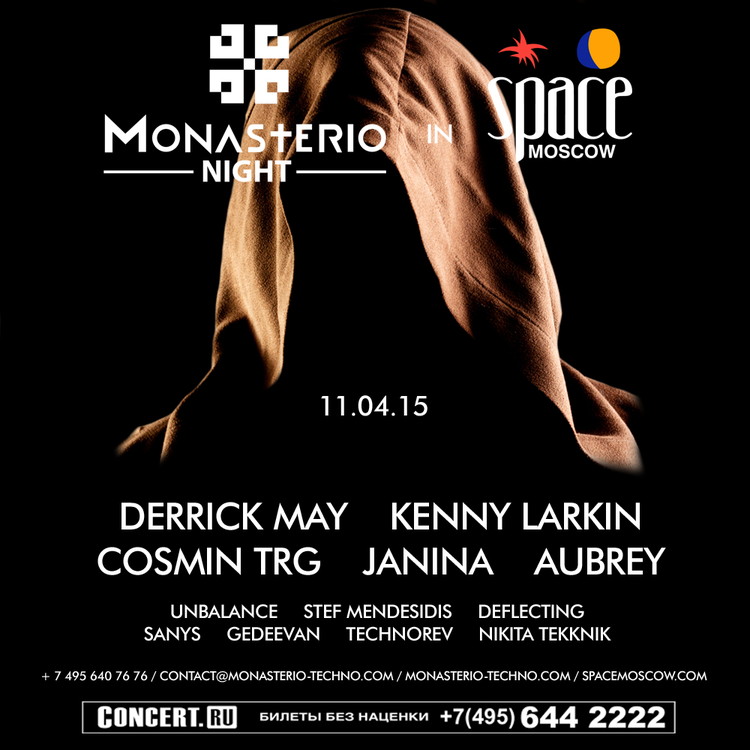 11 апреля Monasterio возвращается в Space Moscow. В эту ночь на самом большом танцполе города соберется мощная конвенция музыкантов из Детройта, Берлина, Лондона и Бухареста. Играть в модулярный техно пинг-понг будут Derrick May, Kenny Larkin, Aubrey, Cosmin TRG, Janina и лучшие российские техно-диджеи из четырех городов страны.