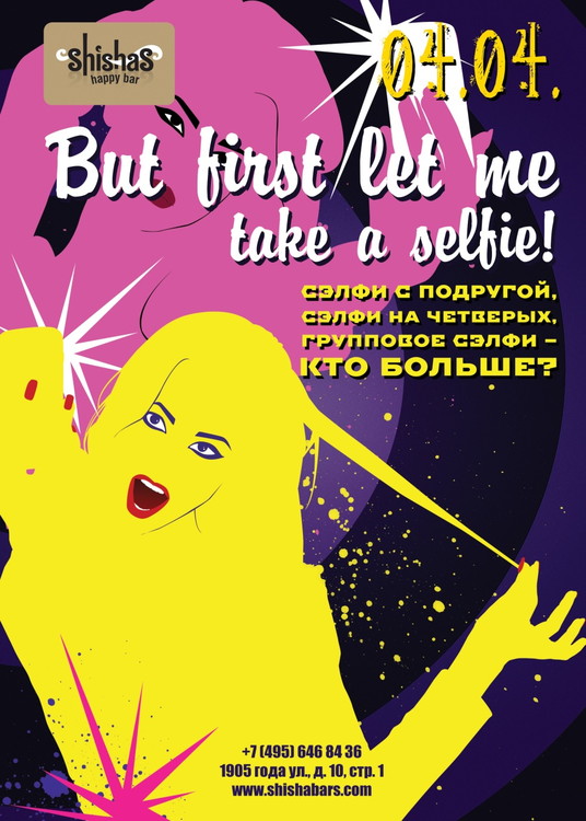 Сэлфи – отличный повод познакомиться, обновить свой мир новыми людьми, красивыми и успешными, стройными и соблазнительными! Не жди особого приглашения – делай сэлфи перед выходом и следуй в Shishas Happy Bar на 1905 года! Здесь тебе поставят столько лайков, что ты и мечтать не мог! :) И сами не ленитесь нажать на сердечко – лайков, как и сэлфи много не бывает!