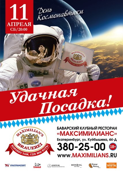 Наш ресторан начинает отмечать этот праздник 11 апреля. В этот день вас ожидает Яркая шоу программа, космические гости с других планет, межгалактические конкурсы и сюрпризы, призы от нас и наших партнеров. А в полночь, на сцену ресторана «Максимилианс» высадится Звездный десант на вечеринке «Дыхание Ночи».