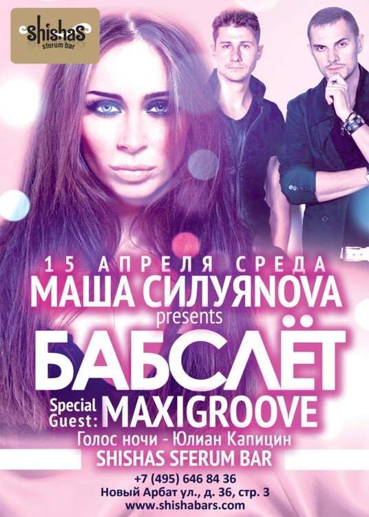 15 АПРЕЛЯ 2015 – БАБСЛЁТ by DJ МАША СИЛУЯNOVA в Shishas Sferum Bar на Новом Арбате! Отдыхаем красиво и до 6 утра! Special Guest: MAXIGROOVE!