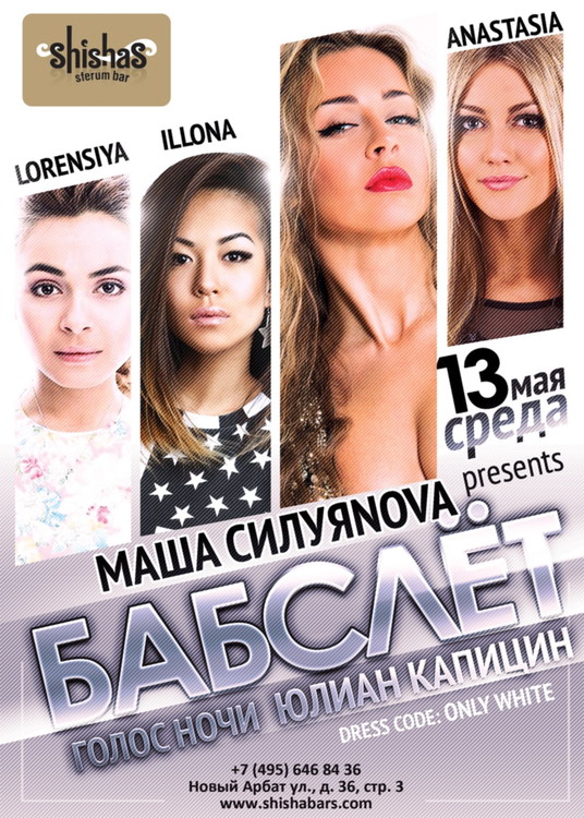 13 МАЯ – среда в Shishas Sferum Bar на Новом Арбате объявляется антигламурной! Инициатор массовых беспорядков – знаменитая королева эпатажа DJ Маша СИЛУЯNOVA! Эта дива танцпола сделает все для того, чтобы Вам сорвало башню – ведь такого массового помешательства Вы еще не видели!