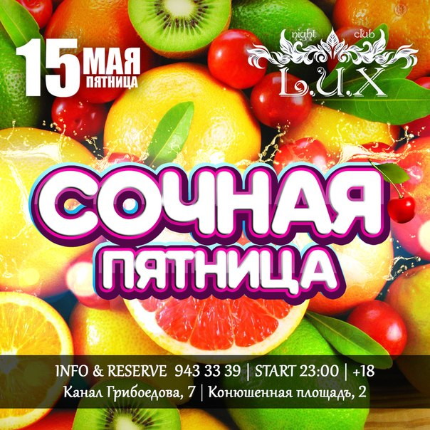 Пятничные вечеринки в L.U.X это уже добрая, многолетняя традиция всех тусовщиков Санкт-Петербурга! В эту пятницу мы пропагандируем заряд позитива и хорошего настроения на всю неделю вперёд! Бери всех друзей с собой - мы ждем Вас на сочной и провокационной вечеринке в самом центре Петербурга!