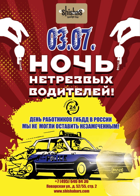НОЧЬ НЕТРЕЗВЫХ ВОДИТЕЛЕЙ в Shishas Lounge Bar на Поварской! День работников ГИБДД в России мы не могли оставить незамеченным! Стоянка и трезвое состояние запрещены! ОТКРЫТА ЛЕТНЯЯ ВЕРАНДА!