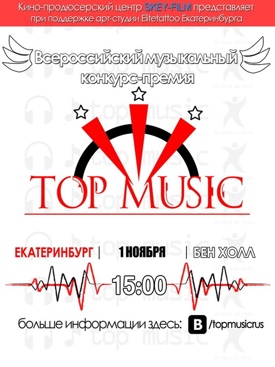 TOP MUSIC - это ежегодный всероссийский молодежный музыкальный проект, который проводится по разным городам РФ, а его финал состоится в апреле 2016 года в г. Москве.