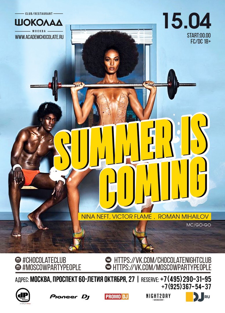 15.04 как всегда новые вечеринки от клуба Шоколад и проекта MOSCOW PARTY PEOPLE "Summer Is Coming" . Лето уже близко, поэтому пора приводить себя в шикарную форму! Клуб Шоколад даёт возможность прокачать все ваши мышцы под самые зажигательные треки наших диджеев: DJ BLACK_T, DJ VICTOR FLAME, DJ ROMAN MIHAILOV, Девушки Go-Go, MC ну и, конечно, нотки эротики, супер позитивная атмосфера и бесконечные танцы!