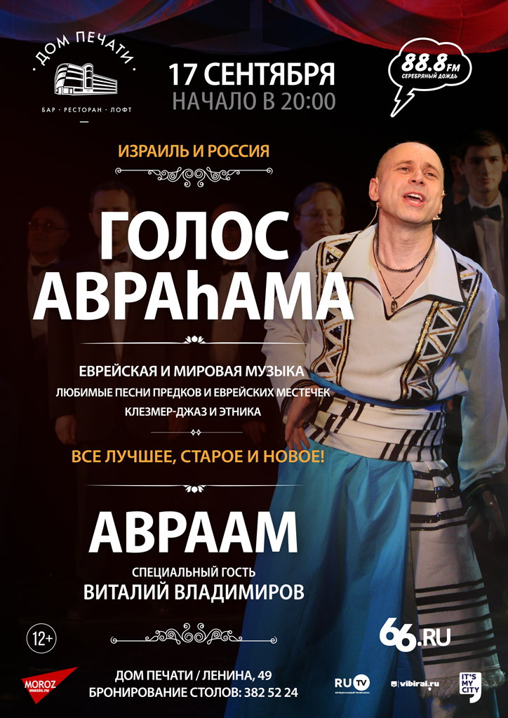 Певец с удивительным, проникновенным, завораживающим голосом. Легендарный ученик Кобзона, творческие и артистические горизонты которого распространяются на многие стили и жанры вокальной музыки. Авраhам —творческий псевдоним Георгия Звягина, который родился и вырос в Свердловске. Специальным гостем программы станет Виталий Владимиров — джазовый тромбонист, дирижер, композитор, лауреат международных конкурсов и фестивалей, лауреат трех премий губернатора Свердловской области «За выдающиеся достижения в области литературы и искусства».