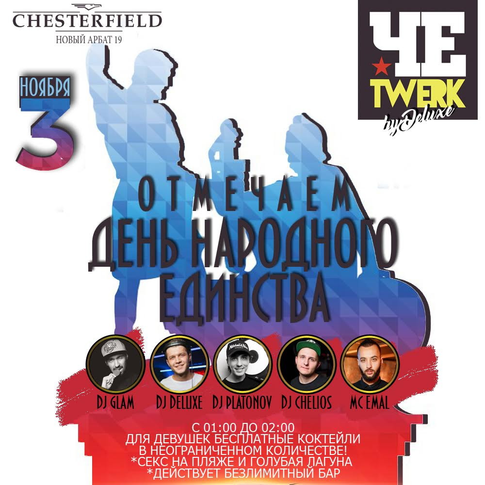 Какая- то больно короткая в этот раз рабочая неделя, мы даже не успели устать! Зато уже сегодня мы вовсю начнем отмечать день народного единства и будем отрываться и танцевать всю ночь вместе с тобой. Ну а руководить всем этим мракобесием и безудержным весельем будут Dj Glam, Dj Deluxe, Dj Platonov и Dj Chelios! У микрофона MC Emal. Смотри, не пропусти!