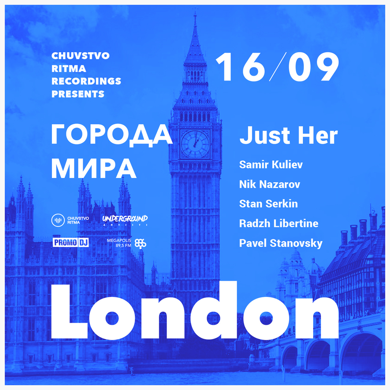 «Чувство Ритма» при поддержке радио Megapolis 89'5 FM начинает серию вечеринок #ГородаМира — музыкальное путешествие по лучшим местам планеты на крыльях музыки. Прологом серии станет город, расположенный на берегах Темзы, по праву признанный музыкальной столицей мира — Лондон. А представлять его будет музыкант, dj, продюсер из Англии, экс участница проекта Him Self Her — Clarie Spooner, ныне творящая под псевдонимом Just Her.