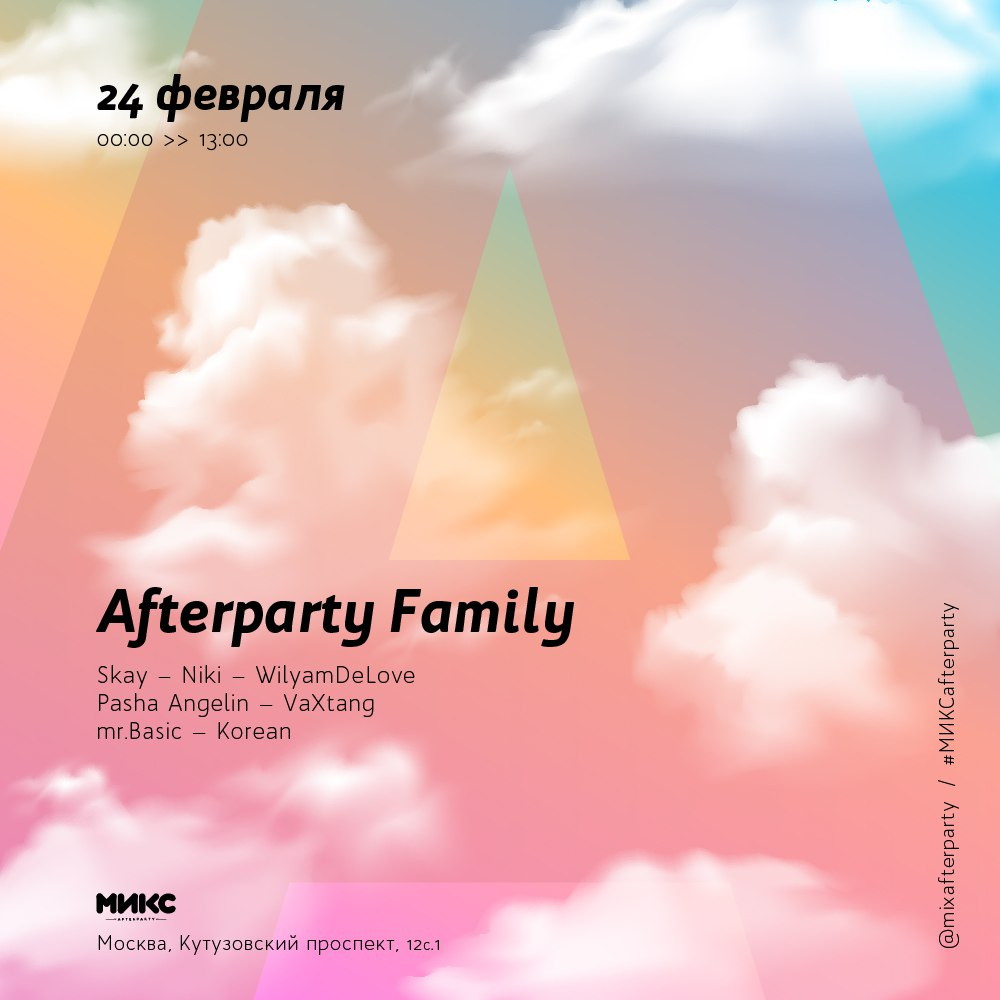 Завсегдатаем ежемесячного расписания главного afterparty столицы уже многие месяцы является вечеринка AFTERPARTY FAMILY, где собираются лучшие диджеи десятилетия, да бы собрать старых друзей и вспомнить хиты дэнсфлоров прошедших лет, да бы просветить новое поколение треками, не имеющими давности, которые навсегда останутся в наших сердцах.
