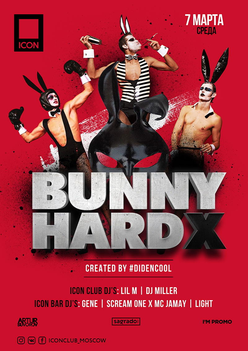 Этот длинный уикенд ICON посвящает женщинам. 7 марта мы дарим прекрасной половине человечества танец настоящих мужчин. Автором волнующе-эротического перформанса Bunny Hard X стал креативный директор клуба Eduard Didencool.
