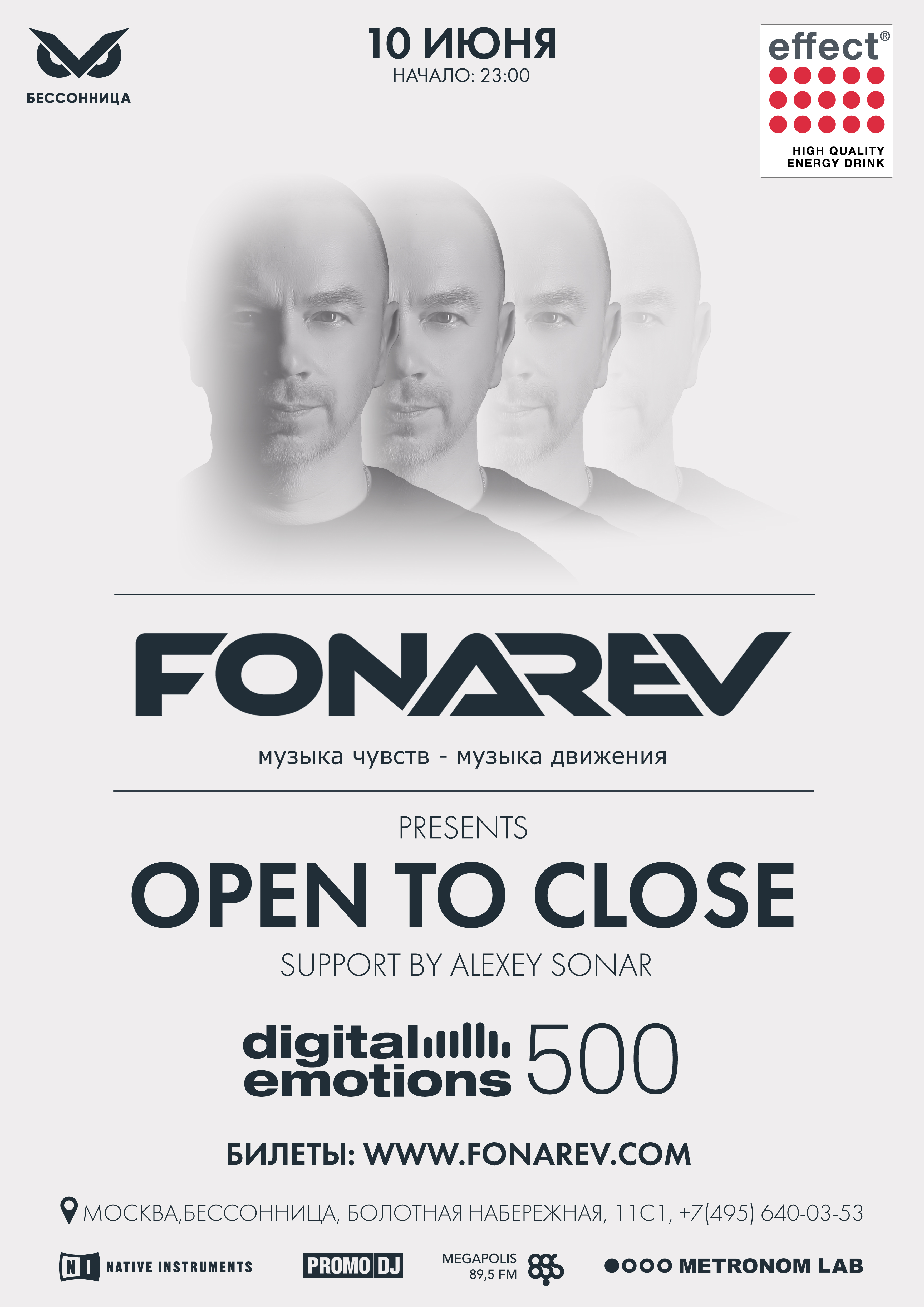 2018-й получается для Digital Emotions юбилейным. В этом году российский клубный бренд отмечает сразу две круглые даты: выход пятисотого выпуска радиошоу Digital Emotions и десятилетие промо-группы. Первая вечеринка посвящена радио-юбилею; 10 июня Владимир Фонарев отыграет восьмичасовой «open to close set» в клубе «Бессонница». Мероприятие пройдет при поддержке энергетического напитка Effect.