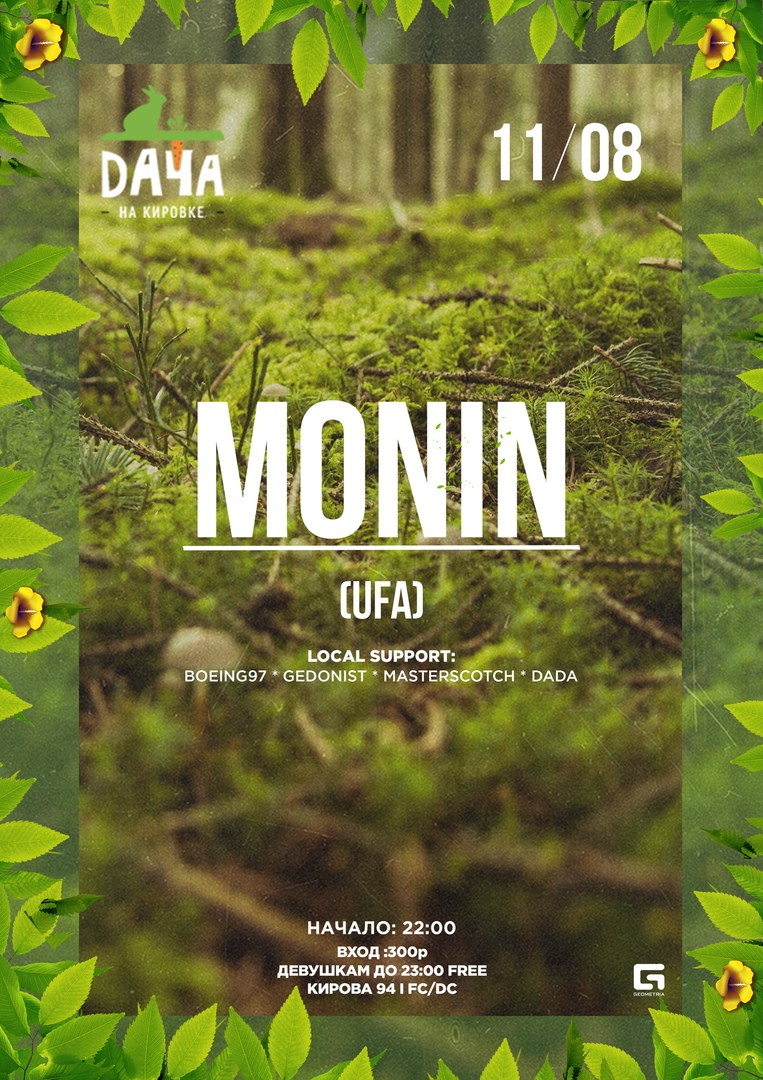 11/08 - MONIN (UFA) - Удваиваем все смешанные напитки и с новой силой встречаем субботу. Отличный шанс поплясать под резидента некогда знаменитого на всю Россию клуба RISE.