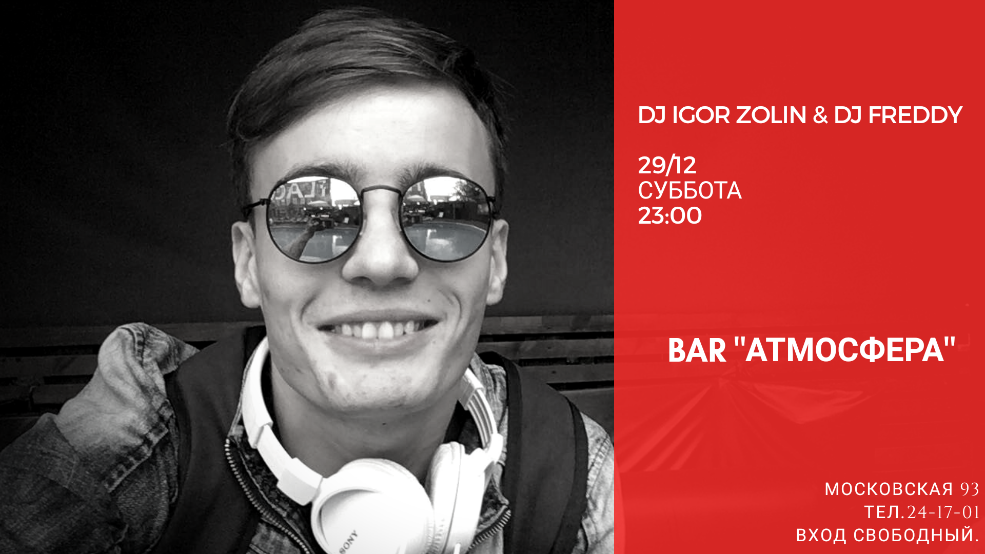 29/12 в эту субботу создаём новогоднее настроение в Атмосфере! Для вас выступят ✌️ : DJ IGOR ZOLIN и DJ FREDDY!!! Одним словом отрываемся до утра