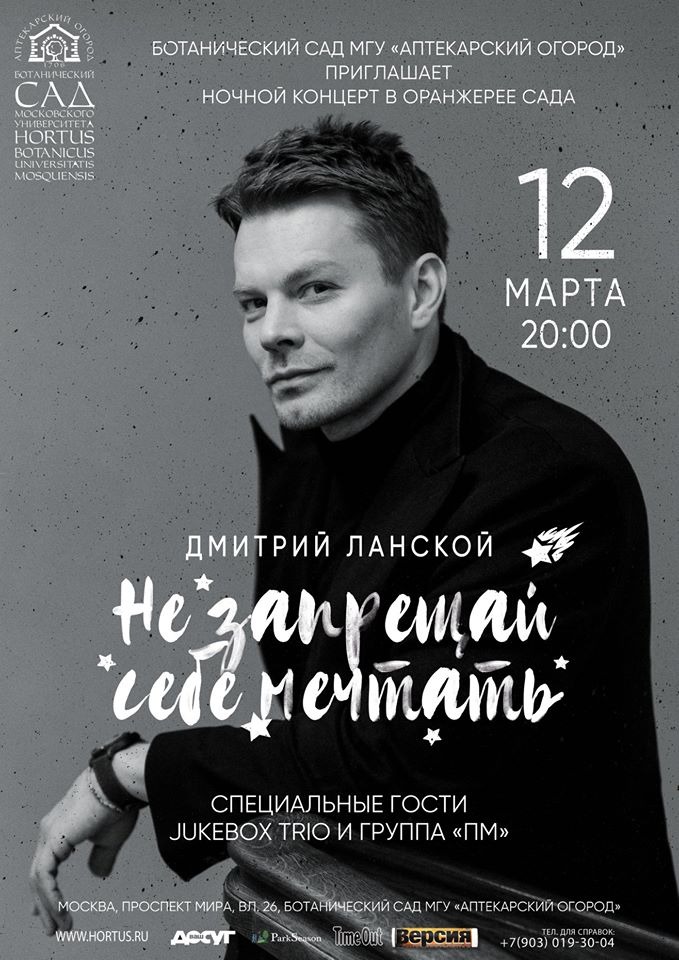 В самом начале весны, 12 марта всех любителей хорошей музыки и поклонников Дмитрия Ланского ждёт настоящий сюрприз: певец представит новую концертную программу в Аптекарском огороде МГУ:https://hortus.ru/concerts/12-marta-v-2000-dmitrij-lanskoj-ne-zapreshhaj-sebe-mechtat-konczert-v-oranzheree.html