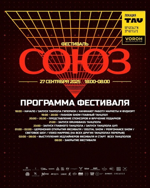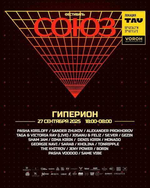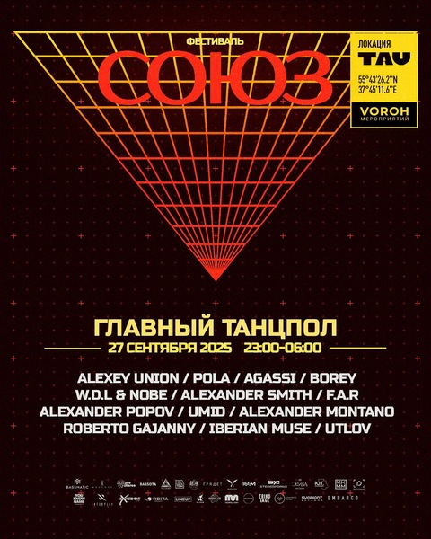 СОЮЗ — это не просто фестиваль, это событие, которое объединяет лучшие промо-команды Москвы и привлекает внимание к современной электронной музыке. В этот раз фестиваль пройдет 27 сентября в пространстве TAU в Москве, на Рязанском проспекте, 8Ас10, и продолжится до утра 28 сентября.